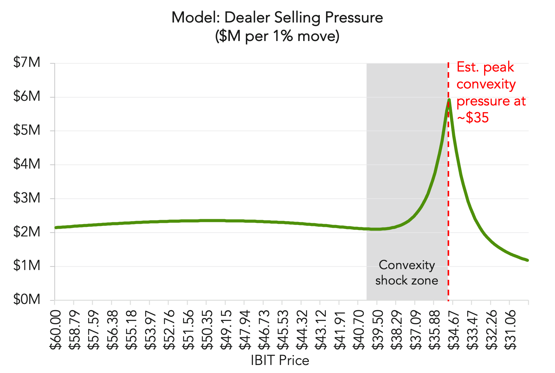 Our model estimates that this dynamic becomes increasingly pronounced as IBIT approaches key downside thresholds. As illustrated in Figure 1, dealer hedging pressure rises sharply in what we describe as a potential “convexity shock zone” where prices approach $35. Once these levels are reached, relatively small price moves can trigger disproportionately large hedging flows.