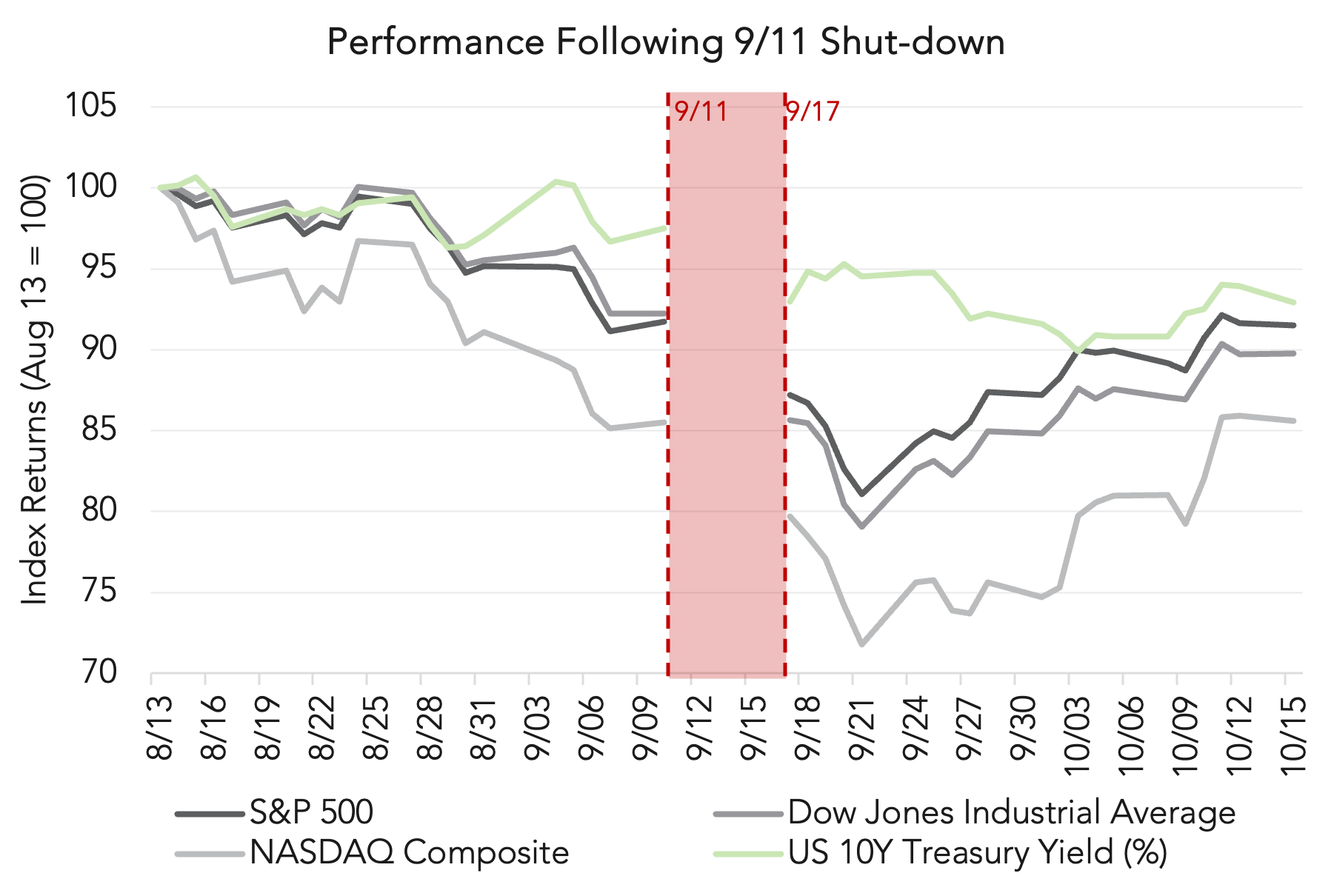 When U.S. markets reopened on September 17, 2001, after a four-session shutdown, the Dow had fallen 7.13%, the S&P 500 was down 4.92%, NASDAQ dropped 6.83%, and Treasuries saw a 4.63% loss (Figure 5). Beneath the surface, financial infrastructure was under strain, with Treasury settlement failures elevated until early October as desks struggled to clear and deliver securities. These operational challenges, though not visible in price data, contributed to the slow pace of recovery and exposed the vulnerabilities of concentrated, centralized market infrastructure under stress.